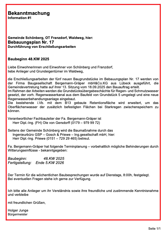 Schönberg zählt zu den großen Gemeinden des Amtes Sandesneben-Nusse. Neben zahlreichen Arbeitsplätzen im Bereich der Handwerks- und Gewerbebetriebe bietet das ländliche Dorf eine Turnhalle für kulturelle und sportliche Aktivitäten.
