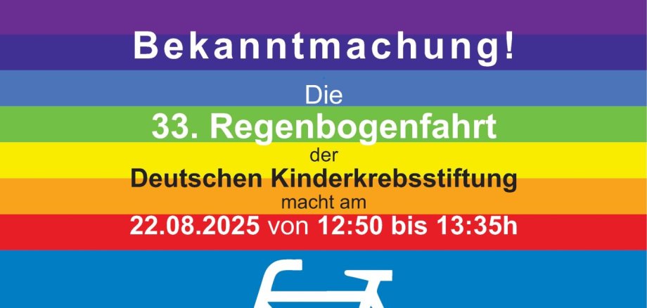 Die 33. Regenbogenfahrt der Deutschen Kinderkrebsstiftung macht am 22.08.2025 von 12:50 bis 13:35h mit 33 Teilnehmern Station in Schönberg im Gemeindehaus, Dorfstraße 24, und fährt im Anschluss weiter zum Tagesziel nach Lübeck (UKSH).