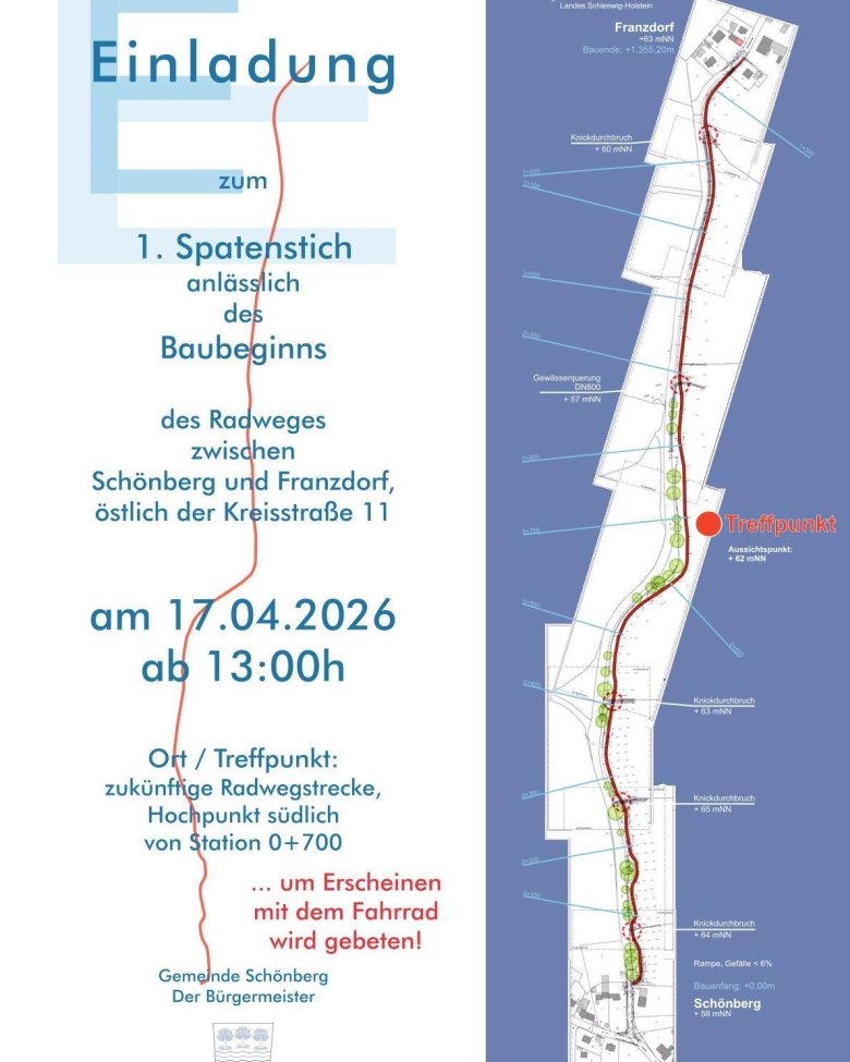 Die Gemeinde Schönberg lädt alle Bürgerinnen und Bürger herzlich zum Spatenstich für den neuen Radweg zwischen Schönberg und Franzdorf ein.